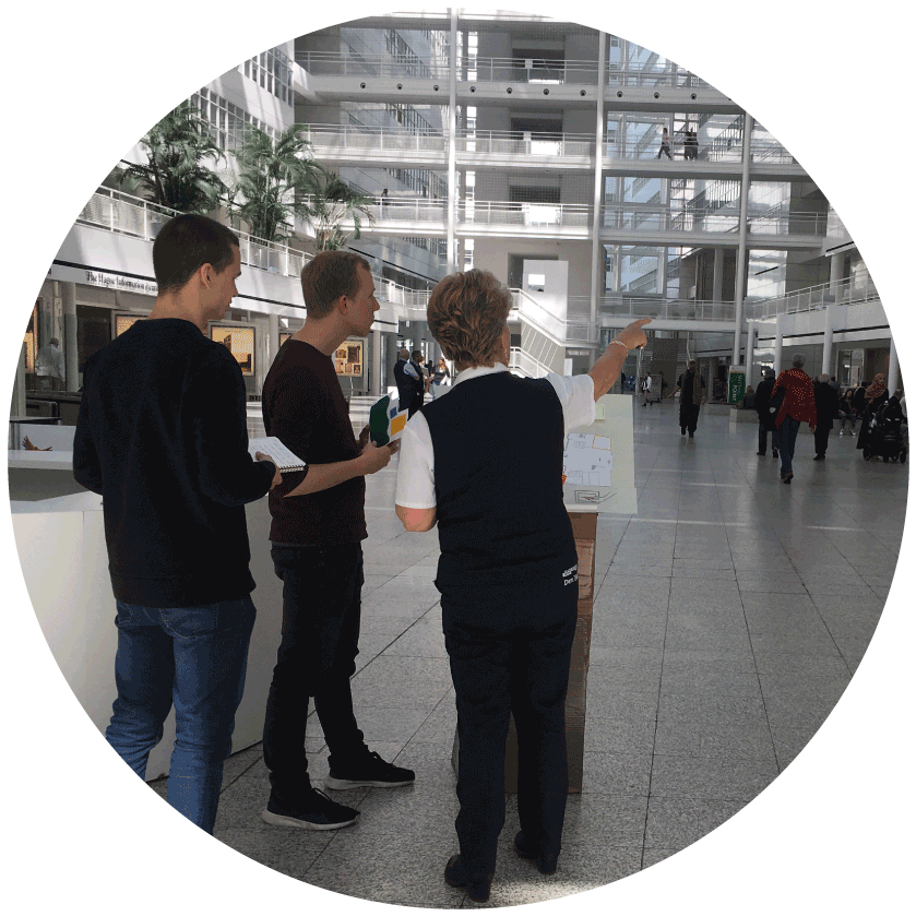 For our research we used a combination of methods to gather a variety of data. We observed the visitors during their visit to the atrium and conducted interviews with them. Besides that we created a behavioural map to gain a pather understanding of the pathing and touchpoints of the users.